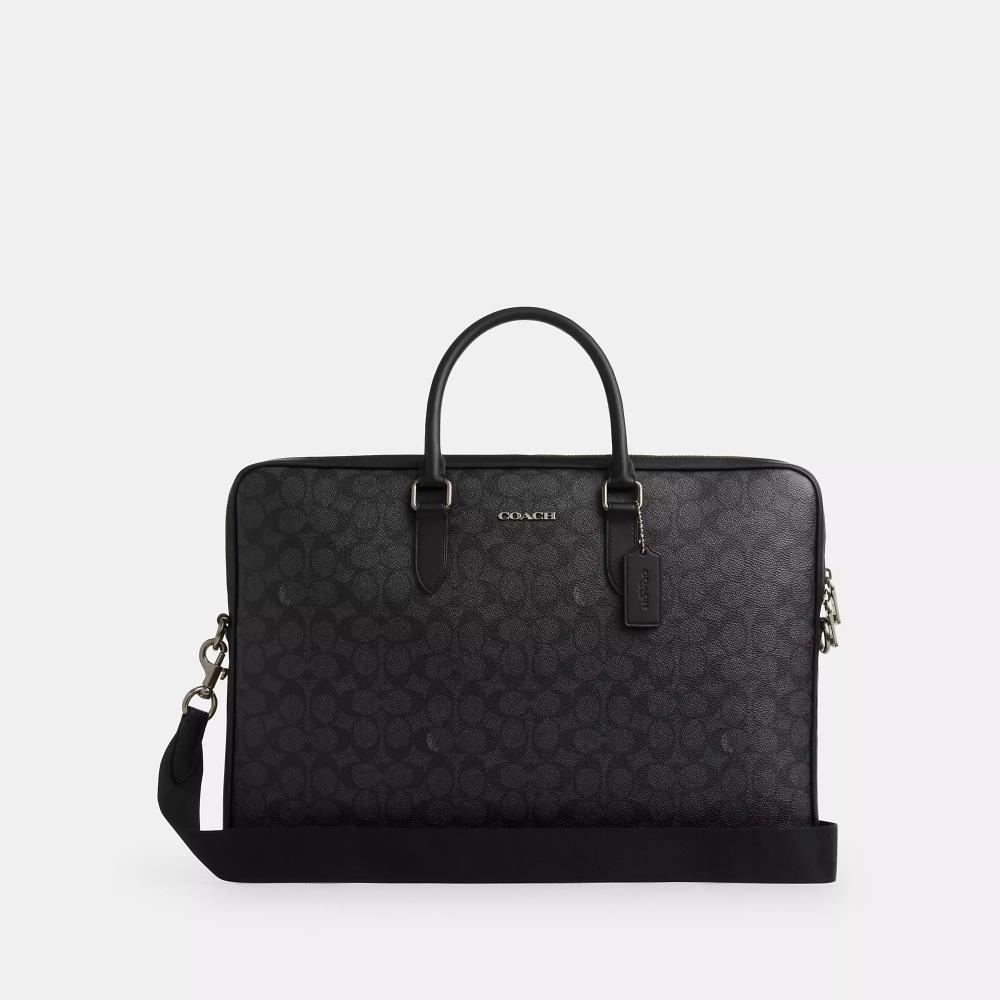 The Coach Ethan Large Brief is crafted from signature coated canvas and smooth calf leather. It features multifunction pockets inside, a zip closure with fabric lining, and handles with a 4 1/2 drop. The exterior includes a slip pocket, and it comes with a detachable strap with a 25 drop for shoulder or crossbody wear. The dimensions are 17 1/4 (L) x 12 (H) x 1 3/4 (W). Style No. CCF56.