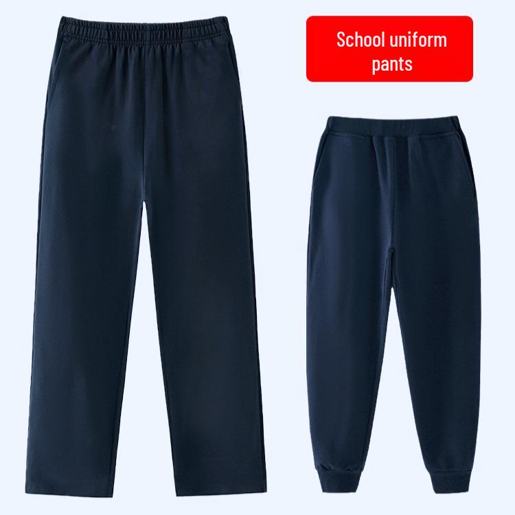 Estas calças desportivas retas com forro de fleece azul escuro são concebidas para raparigas do ensino primário, tornando-as uma escolha ideal para um uniforme escolar de primavera e outono.. Confeccionada em algodão macio e durável, esta calça oferece conforto e calor durante as estações mais frias.. O design de perna reta permite fácil movimento, garantindo que as crianças possam permanecer ativas e confortáveis durante todo o dia escolar.