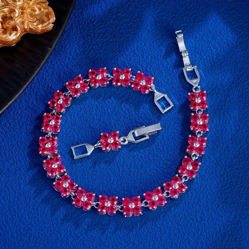 Pera Lovely White Gold Color 4 Leaf Flower Cubic Zirconia Women Fashion Jewelry Tennis Chain Bracelet Bangle with Red Stone B008