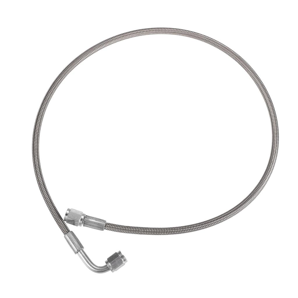Esta linha de alimentação de óleo para turbocompressor trançada em aço inoxidável 3AN possui uma extremidade reta e uma extremidade de 90 graus para facilitar a instalação.