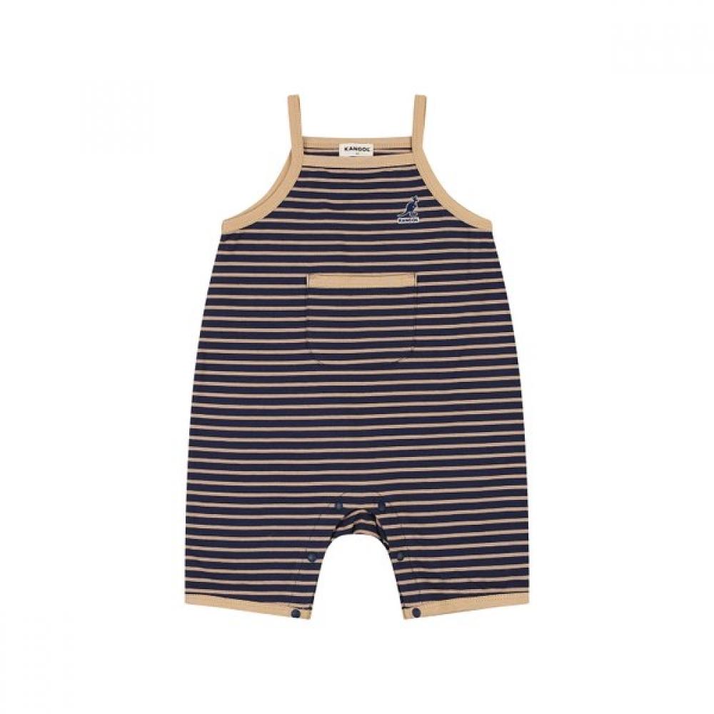 The [Baby] Stripe Sleeveless Romper SB 0A02 Navy is a sleeveless romper made from calm-colored yarn-dyed stripe fabric. The contrasting colors of the top and pants stand out, and a round pocket is featured in the center as a point of interest. With a loose baggy style, it creates a cute silhouette, and the slit at the hem makes it easy to put on and take off.