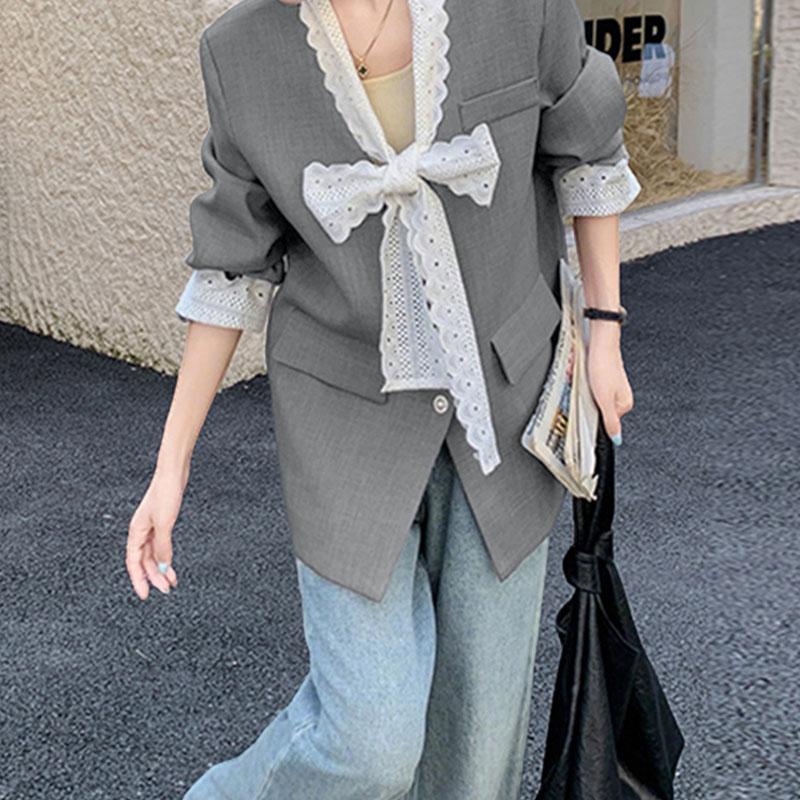 VONDA Women V-Neck Bow Lace Patchwork Long Sleeve Button Thin Cardigan Blazer