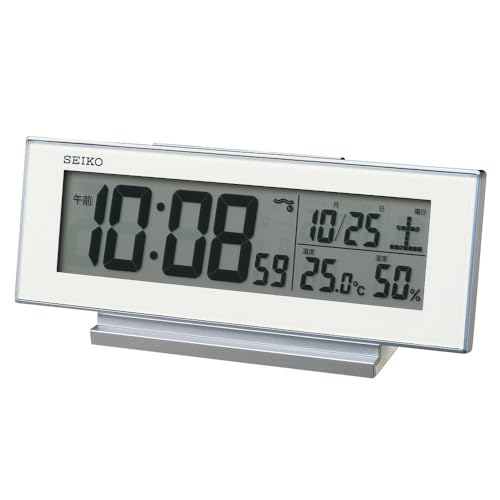 Seiko Clock SQ324W Alarm Clock, Always-On, Radio-Controlled, Digital, Calendar, Temperature and Humidity Display, White, 82 x 206 x 51mm, Visible at N