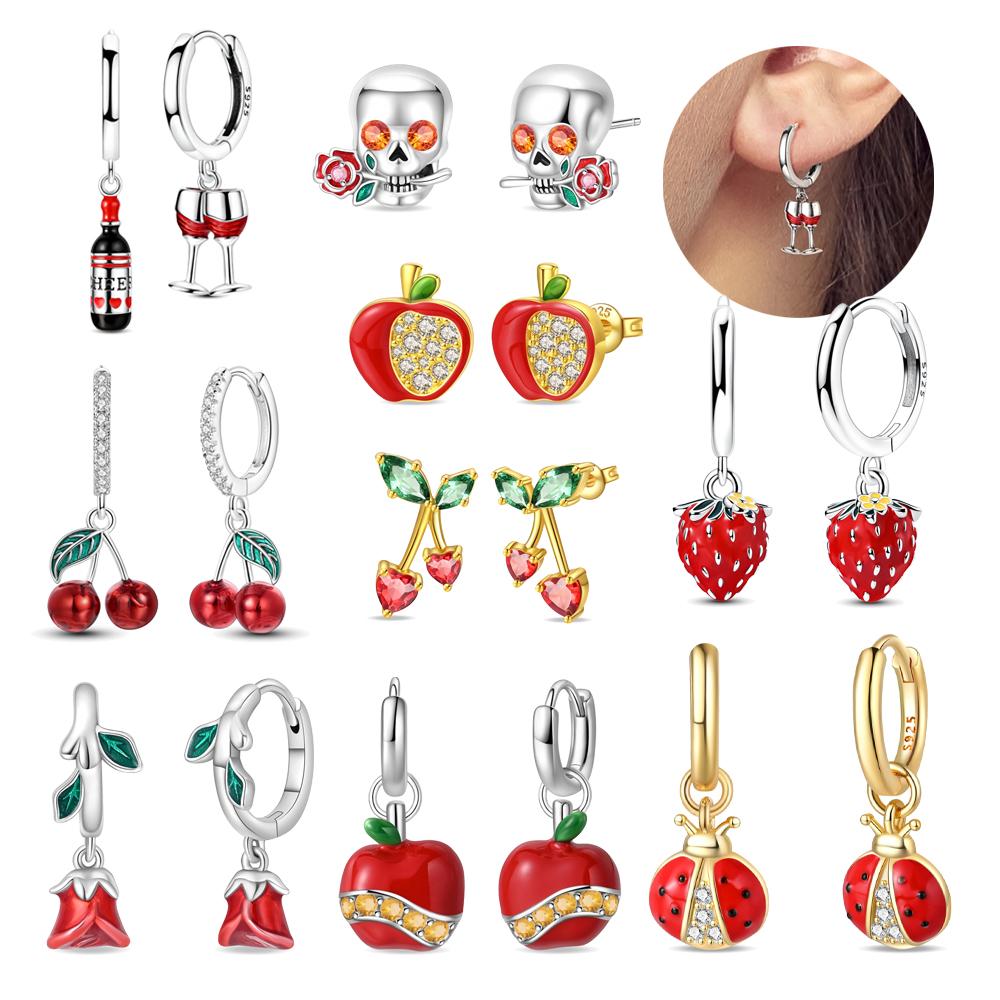 Red Series 925 Silver Apple Strawberry Cherry Rose Ladybug Wine Glass Earrings Fun Birthday Party Gifts