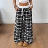 Retro Casual Floor-Length Drapey Wide-Leg Plaid Pants With Elastic Waist Straight-Leg Casual Trousers For Women