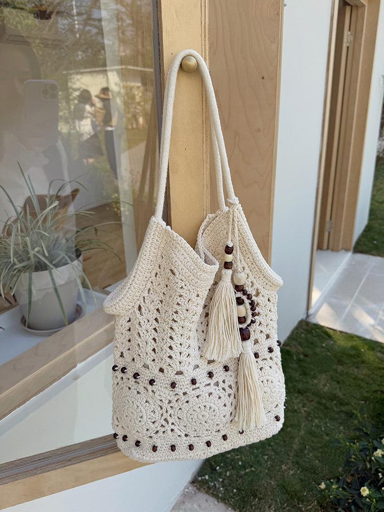 Bolsa de Ombro Tecida Estilo Pastoral Feminina com Franjas Vazadas Grande Capacidade para Férias na Praia Bolsas Tote Boêmia de Axila