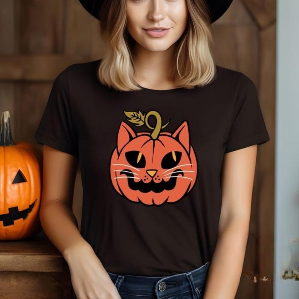 Minimalist Halloween Shirt Pumpkin Cat Face Gift Shirt Retro Halloween Cat Pumpkin TShirt Funny Halloween Women Casual Tops