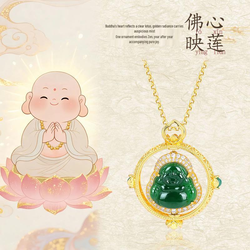 Chinese Style Gold-Plated Jade Maitreya Buddha Pendant Necklace with Rotatable Clavicle Chain