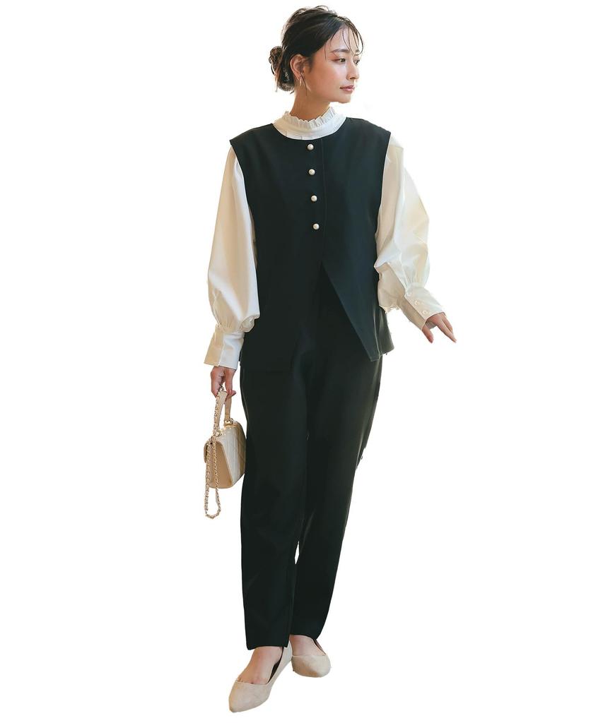 Da série Petite Lettuce, desenhada para mulheres baixinhas, vem um conjunto de 3 peças perfeito para ocasiões formais, incluindo uma blusa, um colete e calças.. A blusa apresenta mangas volumosas e um comprimento perfeito que fica ótimo tanto por dentro quanto por fora da calça.. O colete tem uma silhueta que se alarga ligeiramente em direção à bainha e um comprimento compacto que cria um visual lisonjeiro.. Os detalhes em pérola adicionam um toque de elegância, eliminando a necessidade de acessórios adicionais.. O colete pode ser usado de duas maneiras, frente ou verso, permitindo um estilo versátil dependendo da ocasião.. As calças têm uma silhueta cônica moderadamente relaxada que também cria um efeito de alongamento das pernas.
