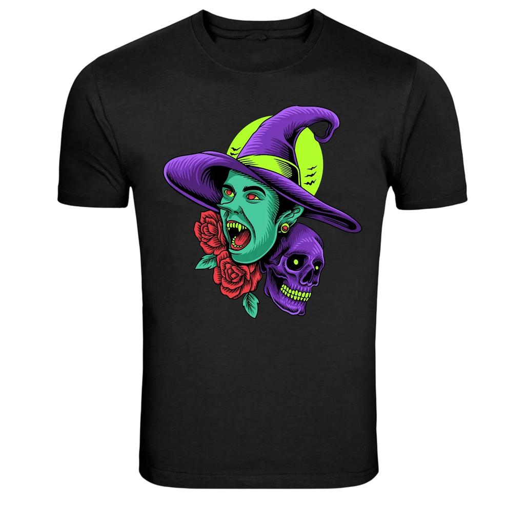 Camiseta Gráfica de Halloween com Bruxa, Caveira e Rosas