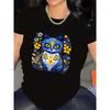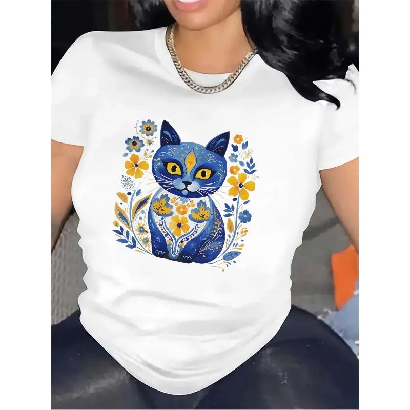 Short Sleeve T-Shirt with Blue Cat Floral Design, Made of cotton Fiber, Lightweight and Durable