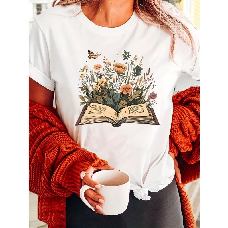 Book Lover Print Crew Neck T-shirt, Short Sleeve Casual Top For Summer & Spring, Women's Clothing