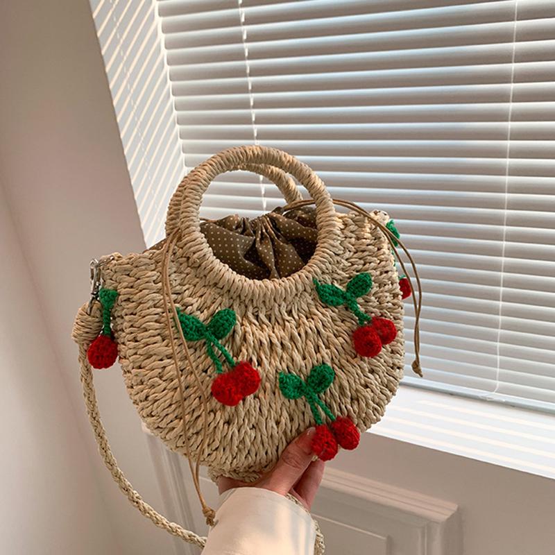 Yogodlns Bolsa de Palha Cereja Feminina Bolsa de Mão Tecida à Mão Formato de Lua Bolsa de Rattan Grande Capacidade Cordão Casual Bolsa de Ombro Cruzada para Praia