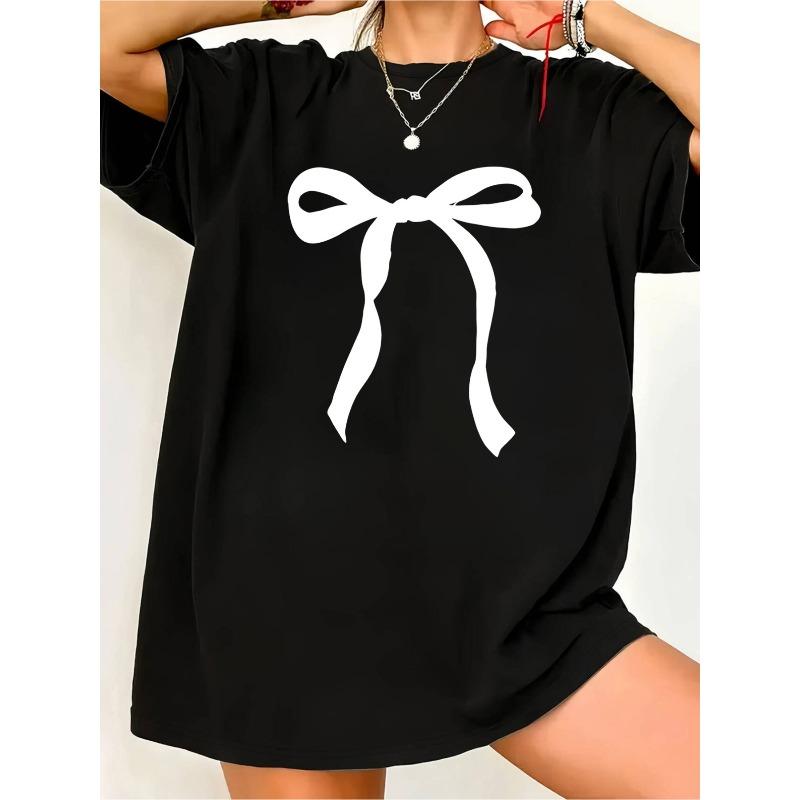 Plus Size Women Oversized White Bow Print T-Shirt Round Neck Short Sleeve All Season Casual Top