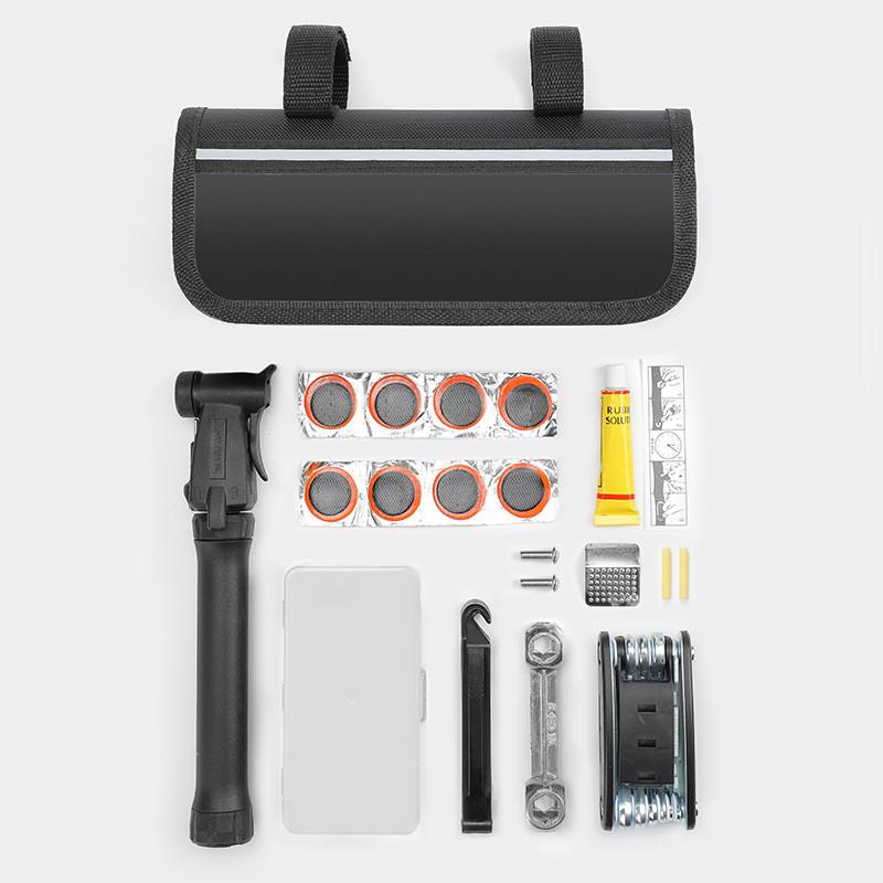 Package Includes: Pump, tire patches, repair wrenches, screwdrivers
