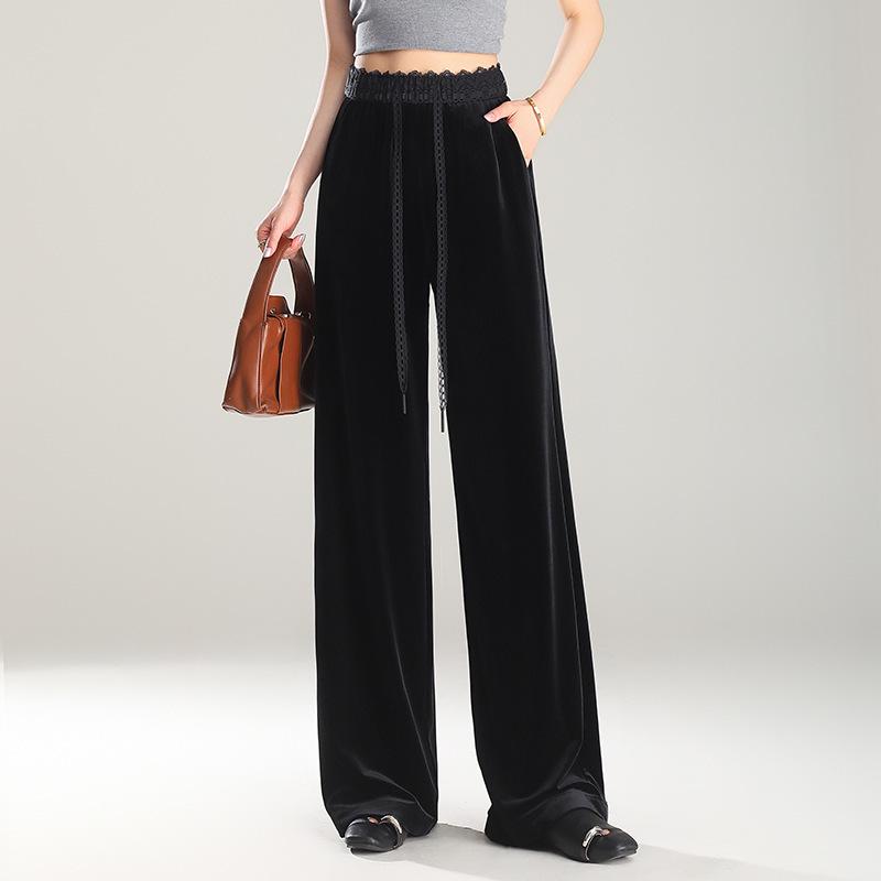 Women's High-Waist Golden Velvet Wide-Leg Pants - Spring/Summer 2026 Collection, Fashionable Black Drapey Casual Style.