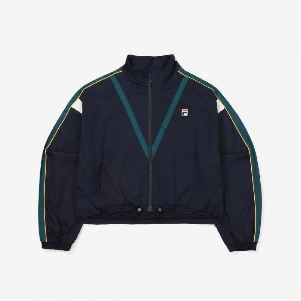 The FILA Color Block Windbreaker is a women's hiking jacket made of 100% polyester. This product is available in Charcoal color and features a front zipper closure and pocket details.