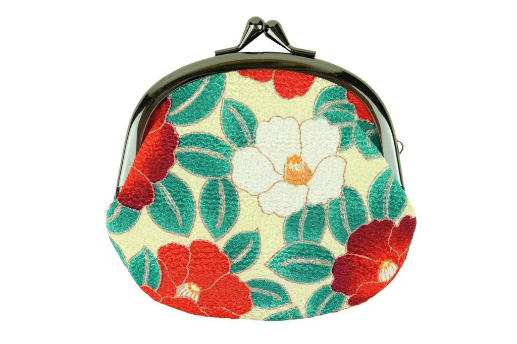 Uni Made in Futago Japanese Clasp Wallet (0224) Seni, Japan, Chirimen, Pattern, 3.3-inch Drop-Shaped [Modern Camellia/Ivory]