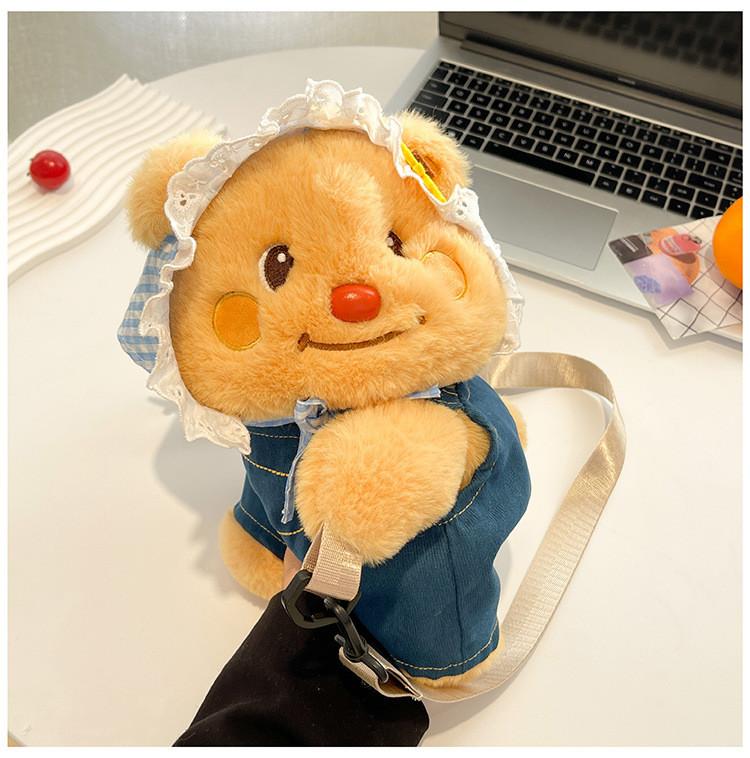 This cute cartoon-style shoulder bag features a soft plush bear design, crafted from breathable cotton material. Measuring approximately 8 inches in height, 7 inches in width, and 2.5 inches deep, it combines a charming appearance with practical size. The zippered closure and inner cellphone pocket support daily organization. Ideal for casual outings and daily use, it resists wear with its lightweight, flexible construction. Wipe clean with a damp cloth to maintain its vibrant appearance.