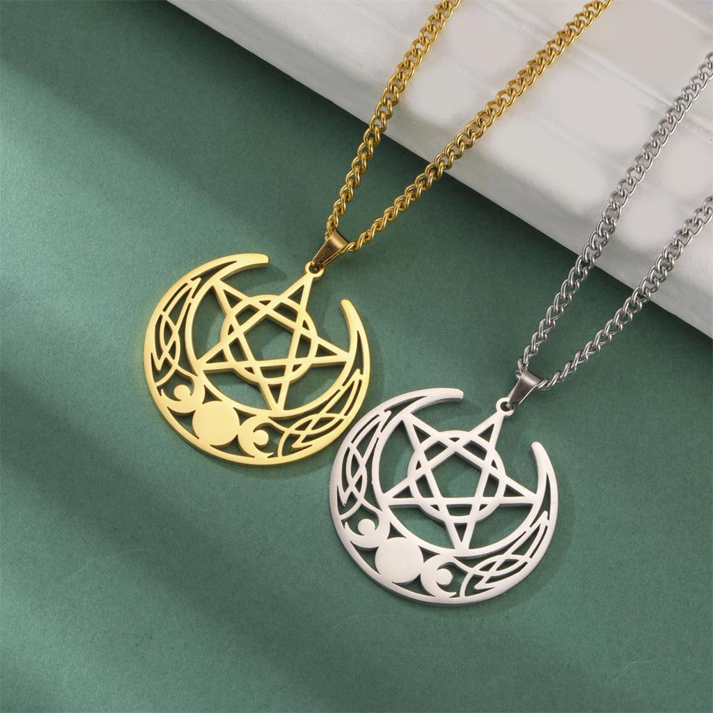 Pentagram Triple Moon Goddess Necklace Stainless Steel Hollow Witch Talisman Necklace Greek Jewelry Gift Wholesale
