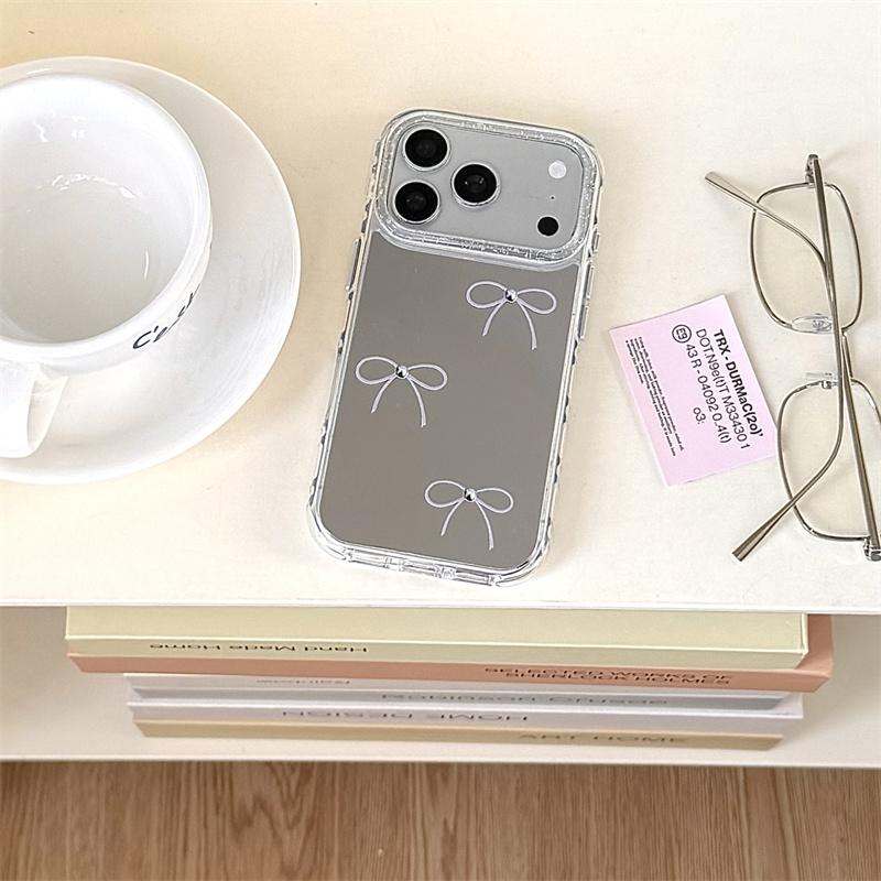 Minimalist Bow Mirror Phone Case For iPhone 17 Pro 16 15 14 Pro Max with Glitter Shockproof 17pro Protective Cover Cases