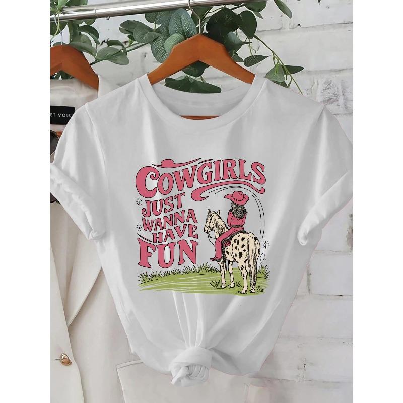 Women's Cowgirl Print Summer T-Shirt - Western Cowgirl & Horse Riding Graphic Round Neck Casual Tee Suitable for Cowgirl Events