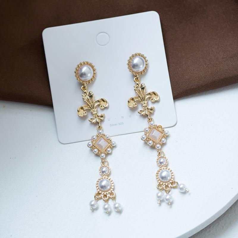 S925 sterling silver needle court style vintage earrings - french pearl long drop earrings & ear clips