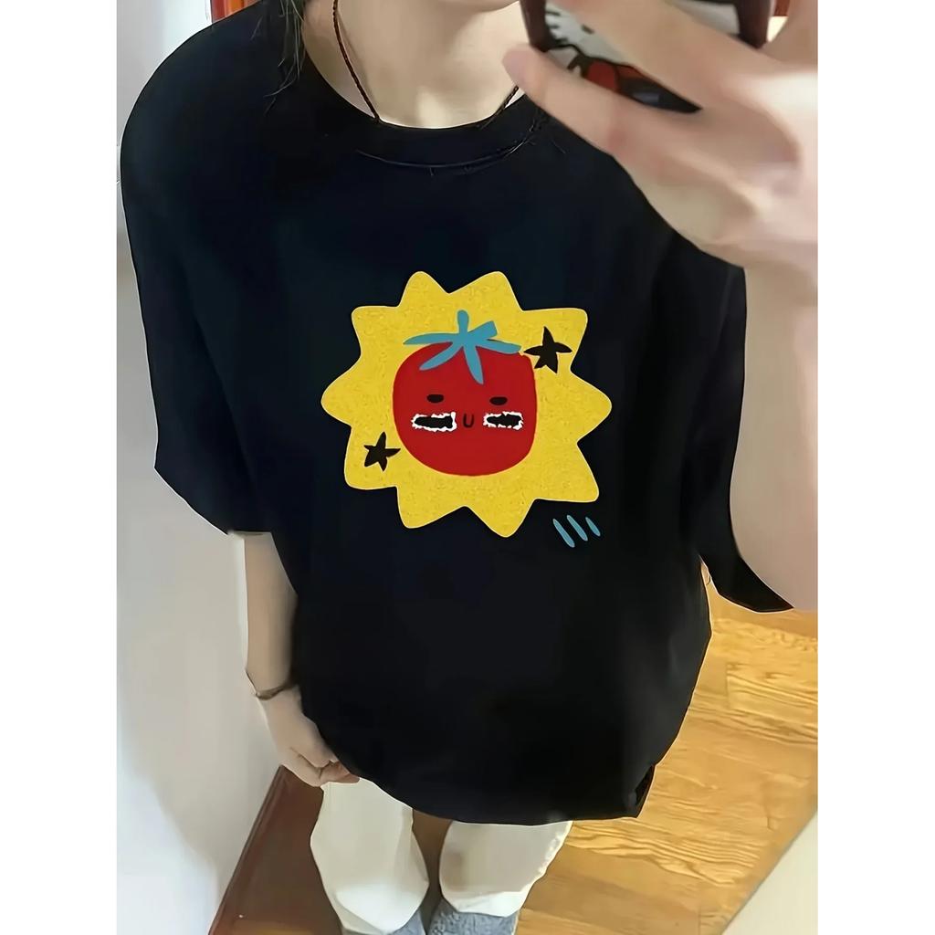 Cartoon Tomato Graphic Print T-Shirt Women Creativity Summer Round Neck Short Sleeve Street Casual Tops Women Clothing