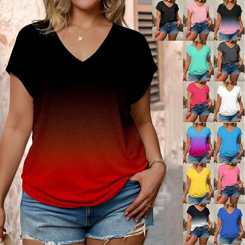 Women Short Sleeve Top Summer Basic Shirt V Neck Gradient Tie Dye Tee Tunic Tops