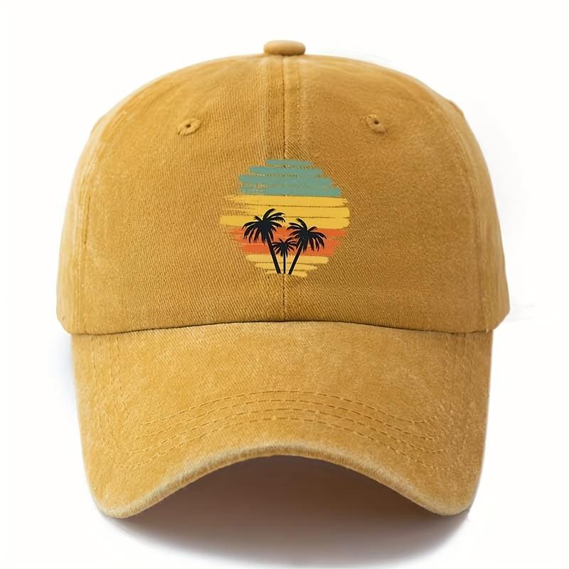 Boné de beisebol retrô com padrão de coqueiro ao pôr do sol tropical, adequado para viagens ao ar livre, acampamento e atividades de lazer.