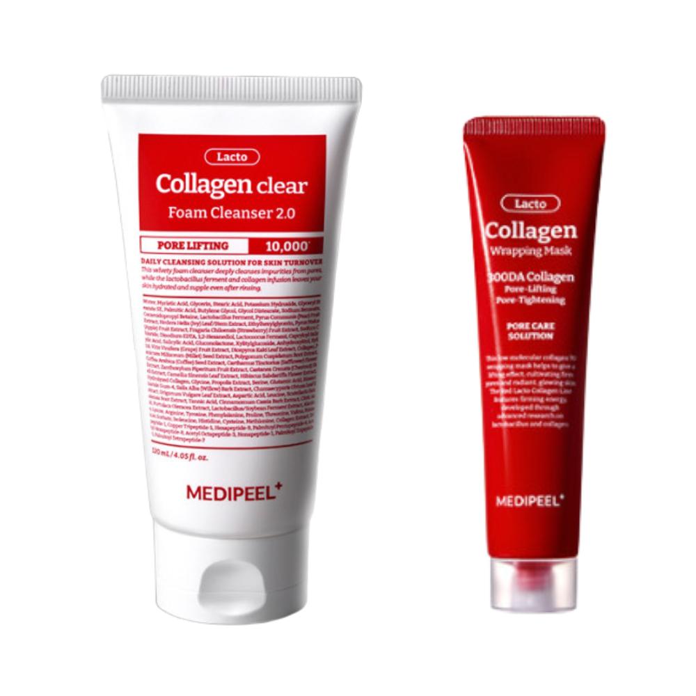 Conjunto MEDIPEEL Red Lacto Collagen, máscara coreana para lifting de poros, máscara de colágeno para embrulhar, Red Lacto Clear 2.0, K-beauty para apertar os poros, máscara de colágeno peel-off, espuma de limpeza MEDIPEEL, cuidados com a pele com lactobacilos, tratamento para elasticidade da pele, conjunto facial sul-coreano