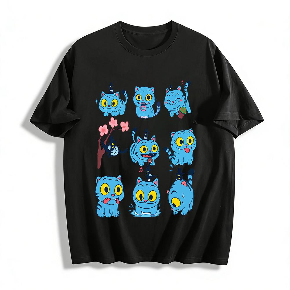 Funny Blue Cat And Little Wizard Printed T-shirt Unisex Casual Cotton Top Pure cotton T-shirt