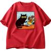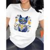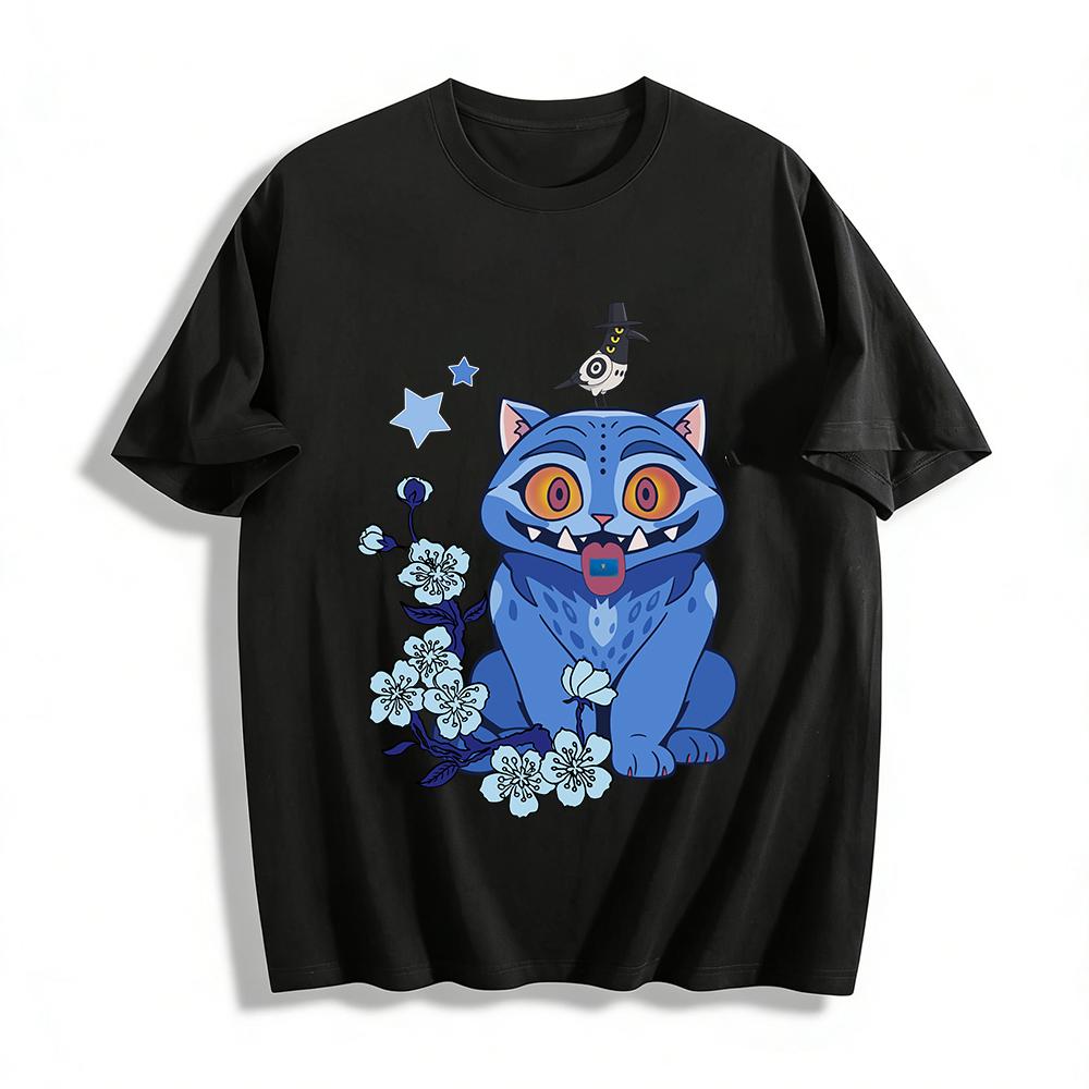Whimsical Blue Cat & Magpie Print Tee,Niche Dark Art Style Loose Crewneck Casual Top Pure cotton T-shirt