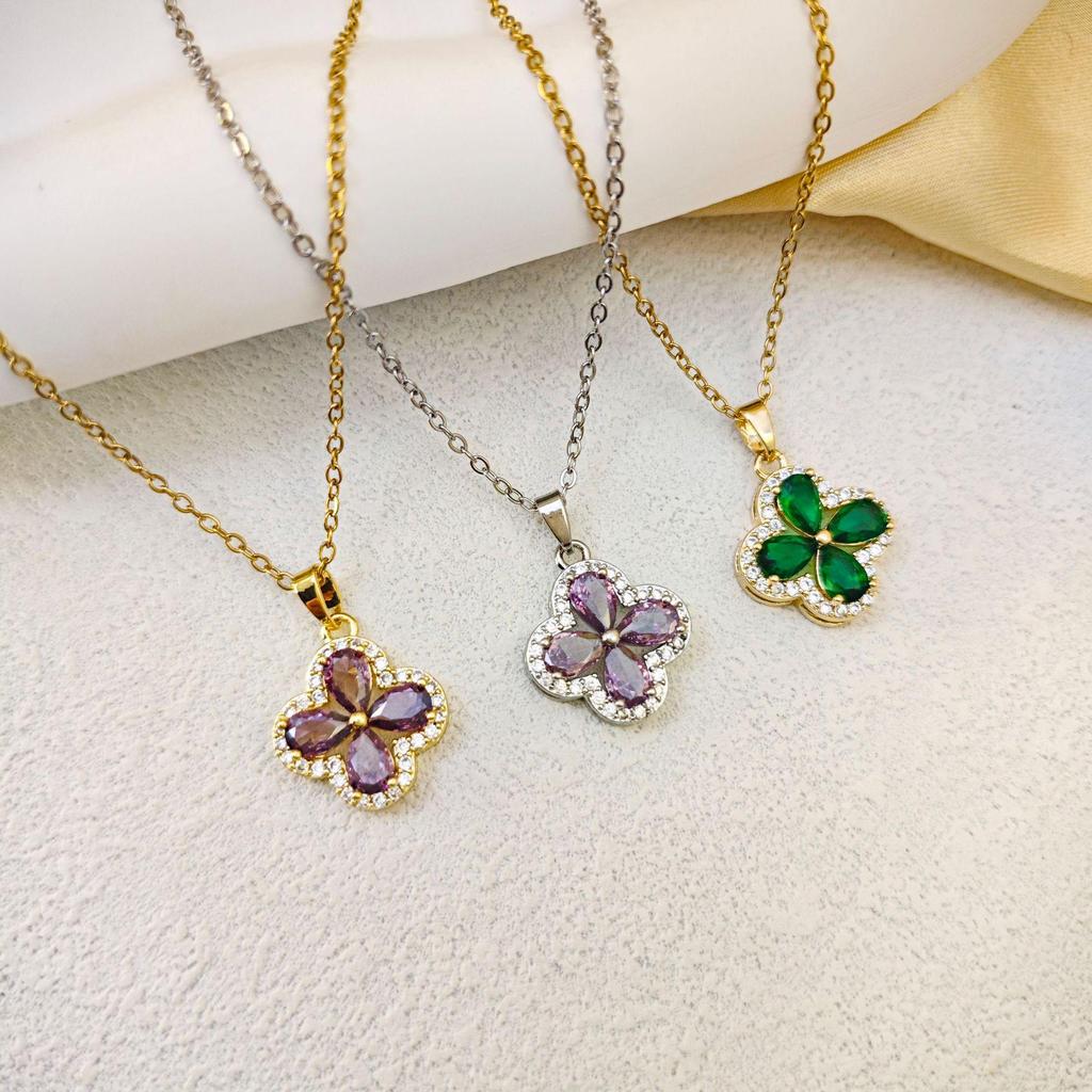 Elegant Purple Diamond Four-Leaf Clover Titanium Necklace for Women – Stylish and Luxurious Clavicle Chain Jewelry.