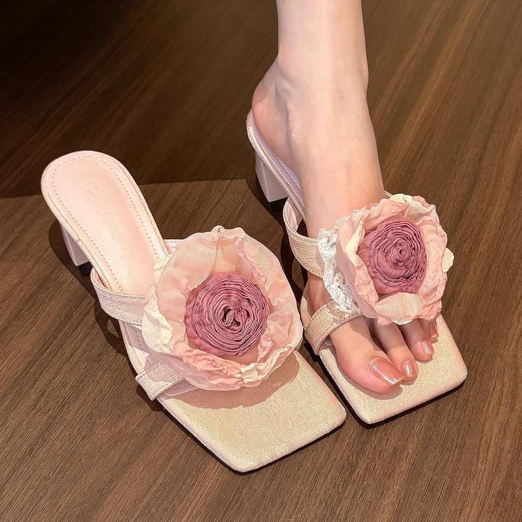 Oil painting is in full bloom! French temperament smudged rose cool slippers women's 2025 summer new thick heel Muller high heels