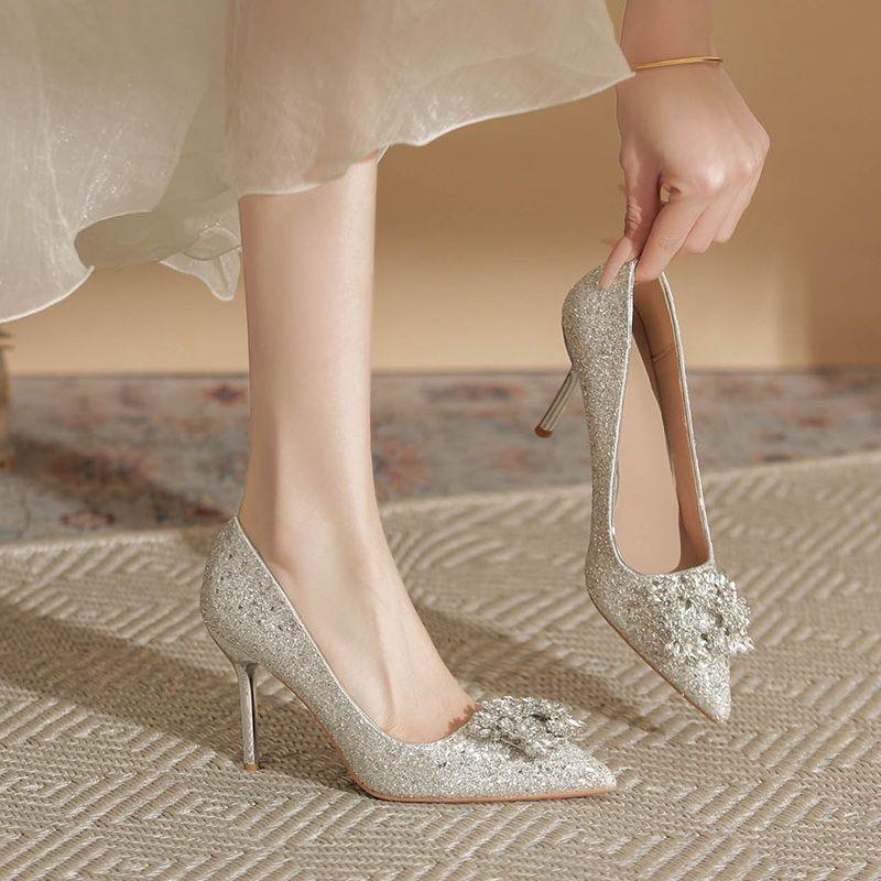 Not tired feet high heels wedding shoes women's 2025 new main wedding dress bride shoes can usually wear bridesmaid shoes French crystal