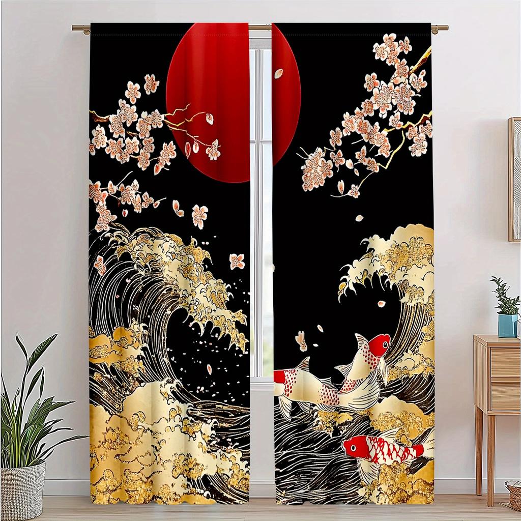 Classic Japanese Koi Pattern Curtains Polyester Fabric Suitable Bedroom Living Room Decoration Set Of 2 Made Decor