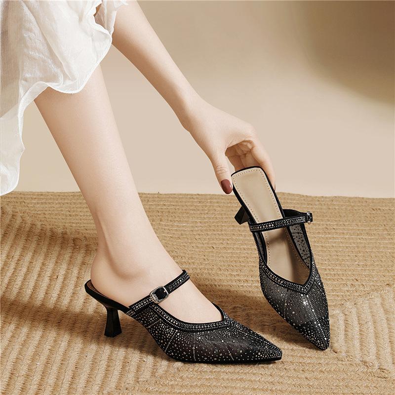 Mary Jane semi-drag sandals breathable mesh casual early spring single shoes light luxury rhinestone pointed stiletto high heels