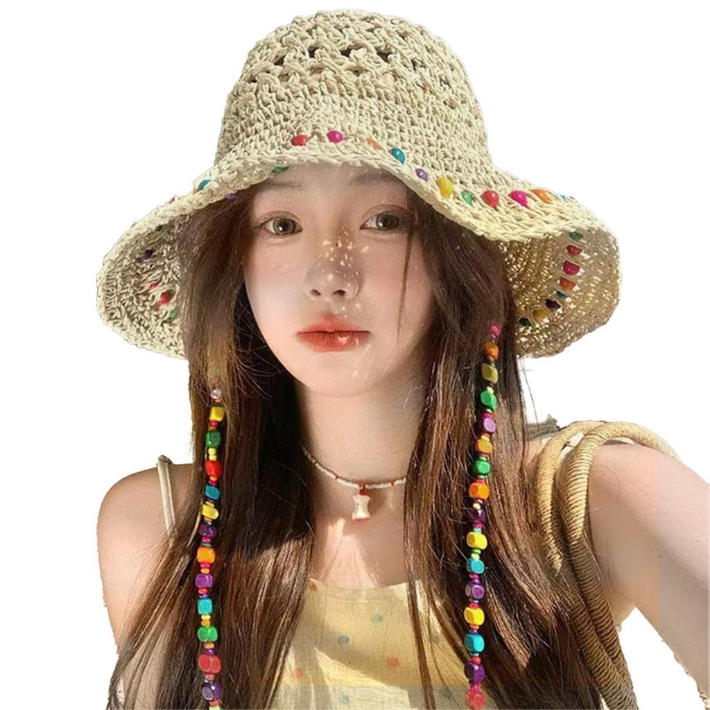 Chapéu de Palha Fofo com Contas Coloridas para Verão Efeito Emagrecedor Proteção UV Material Natural Respirável Fresco Chapéu de Palha Aba Ondulada Proteção UV Chapéu Balde